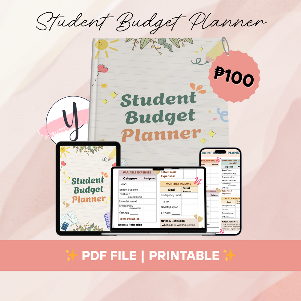 You'll receive a downloadable Student Budget Planner PDF (₱100) to manage your school year finances. Track income, categorize expenses, set savings goals, and analyze your spending habits – all in one versatile, digital planner!